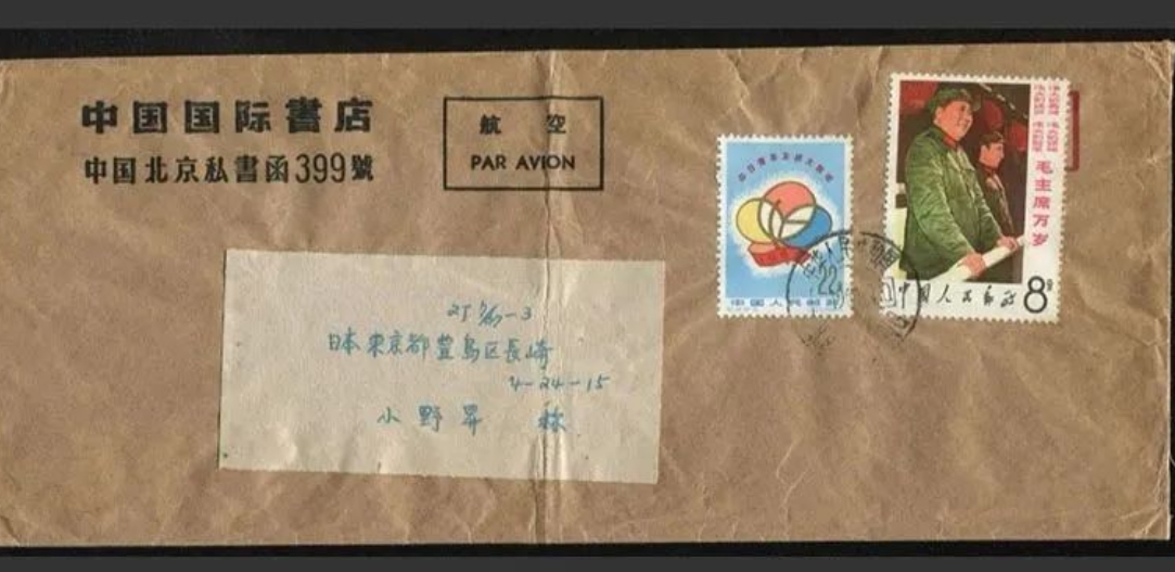 再说回这个文革邮票实寄封吧,这个封是1967年从北京寄出,当年封、原地的感觉有没有。看封还是公函的,中国国际书店,以印刷品形式寄日本东京,销中华人民共和国北京海关戳,典型的航空封。文2中第五枚是“毛主席和林副主席在一起”,画面是毛主席在天安门上的照片。身着军装的毛主席凭栏远望,身旁是副主席林彪。