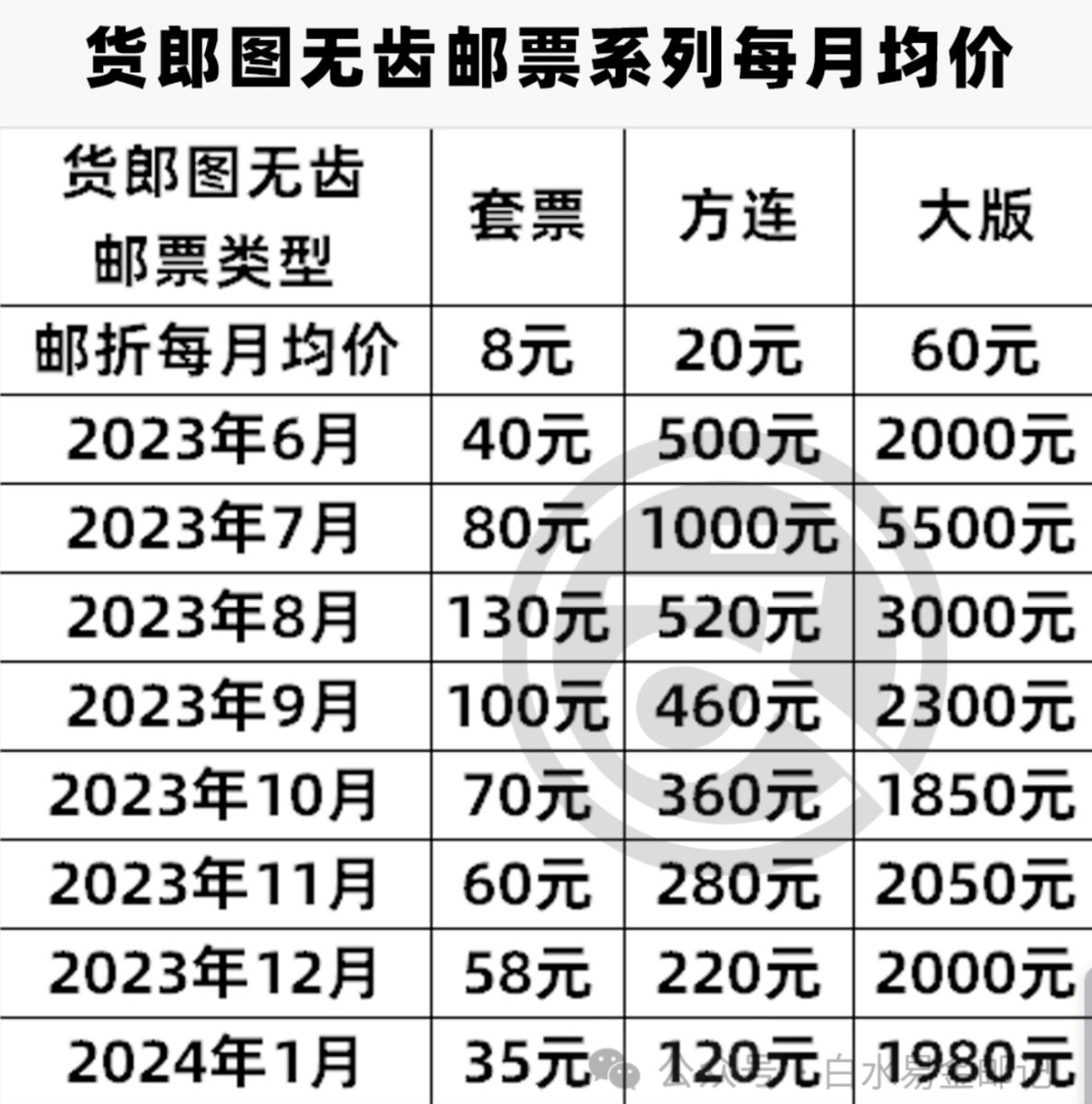 从表格的每月均价发展,就知道目前还是“高开低走”为主线的下滑趋势,这也是特供邮品的特性,次年价格就会大跌,毕竟年年都会推出新形式的特供邮品,发行数量也可能没有最低还有更低的方式促销。在12月大量其他品种邮票抛售入市,导致很多品种在12月底都跌入新低,邮市骂声一片,但我们也看到《货郎图》无齿大版已经保持了3月稳定在2000元/本上下的价格,说明3-4万本的发行数量将是历史新低数量,预期它的市场价格不会有太多变化,假如邮市还有春天,将是一个快速再发芽上涨的品种。而《货郎图》无齿套票和方连,在2023年12月时受配售数量信息公告影响已经下跌至低位,目前几大邮票网站待售数量较大,虽然进入火热龙年,龙年邮票目前在YZ控盘下,龙年系列邮票价格稳定有较高的溢价率,但很多邮商都以观望态度为主,大宗交易并没放大,都清楚现阶段都是推高卖产品阶段,一般在三月份才是较合理价格,没有礼品开发需求都不会大笔投资收购,而且首次发行的龙年贺年钞也将上市掠走大笔收藏资金,所以《货郎图》无齿邮票在2024年1月价格两个品种不太稳定,估计还会继续下滑