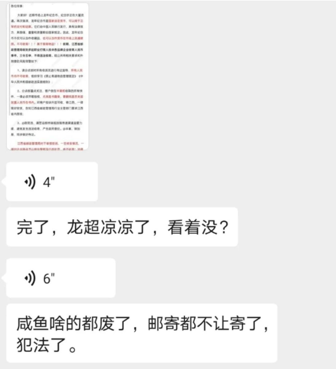 这次突发事件,点名禁止收发邮寄龙钞、龙币。对收藏市场的情绪产生了一定不良影响。