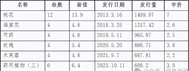 2013-2023年花卉邮票成为打折的重灾区? 日期:2024-01-26 来源:驿路邮缘 花卉题材之前一直是热门,但近几年也成为打折的重灾区。 下面来盘点一下2013年以来的花卉题材邮票有哪些: 2013-2023总计发行花卉题材6套,全部都打折了,从2019年开始发行量降至1000万以下,尽管如此,还是打折了。 来源:邮海浮云