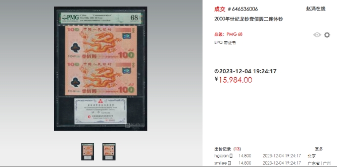 近期,一枚特殊的世纪龙钞二连体在拍卖市场上创造了1.6万元的高价成交纪录。