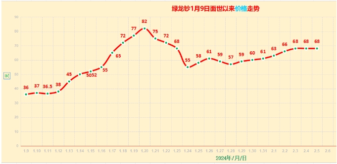 缅A的脊梁一直挺不起来啊!感觉还是小龙钞好,走的稳稳当当。一、下图是2024年贺岁纪念钞,简称龙钞、小龙钞或者绿龙钞,自2024年1月9日兑换面世,到2月5日的价格走势变化情况。以标准十连号价格为参考,市场波段较大,没有统一的收盘价格标准,走势曲线价格点仅仅是取一个大概值。