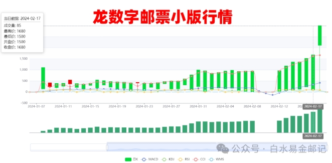 领头龙--是龙邮票数字小版,整个运行曲线都还在拉升中,春节前不到1000元/本,节后跳空拉升到1800-2000元/本。拉升状态很疯狂,赶超货郎图无齿大版邮票的感觉。从两月的市场行情和成交数量来看,整体还是量价齐升的爬坡状态(曲线图点击可放大浏览)。