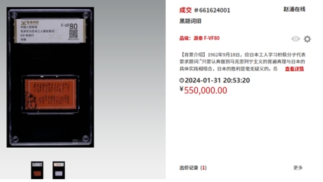 这枚黑题词成交于本年的1月31日,成交价为55万,可以说这就是大珍的含金量了,也为龙年开年增添了一丝喜庆的气氛。