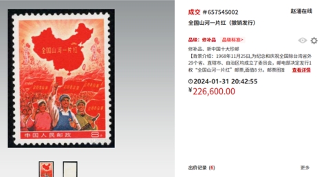 今年初成交的两枚“一片红”中 ,其中上面这一枚上品信销票,有折印,其成交价达到了33万,而下面这一枚则为修补品,为未使用的新票,成交价为22.66万。