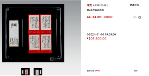 还有这枚文7四方连,获得了源泰评级的VF96分,在源泰评级认证加持下,这套邮票的成交价为10.56万。