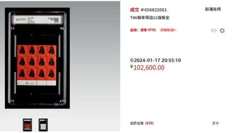 后面还有这枚T46猴年带边12连,源泰评级VF95分全品品相,其最终的成交价为10.26万。80金猴发行至今四十余载,收藏价值经久不衰。