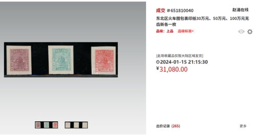 接下来是一套东北解放区火车图包裹印纸,无齿,其面值分别为30万、50万和100万,品相为上品,其成交价格超过3.1万元。