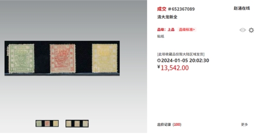 以中国发行的第一套邮票——大龙邮票收尾,品相为上品,1.35万元成交。