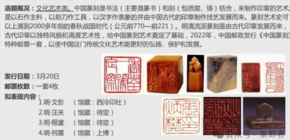 中国邮政计划于2024年3月20日发行的志号2024-3T《中国篆刻(二)》特种邮票一套4枚,面值均为1.20元,全套面值共4.80元。设计师:容铁,整版12枚,邮票规格30×60毫米,齿孔度数13.5×13度。另发行版式二,包含2套邮票,面值9.6元。票名分别为: