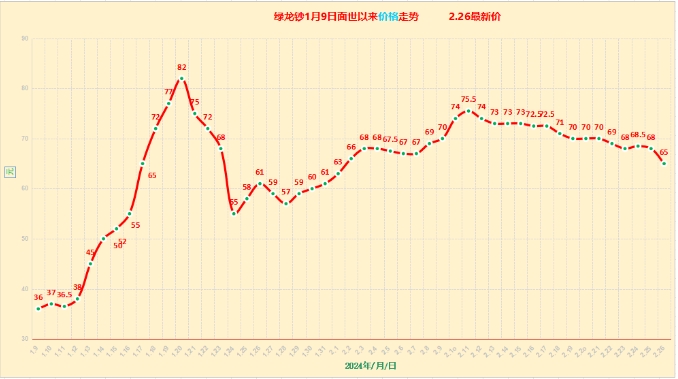 一、下图是2024年贺岁纪念钞,简称龙钞、小龙钞或者绿龙钞,自2024年1月9日兑换面世,到2月26日的价格走势变化情况。以普通标准十连号价格为参考,市场波动较大,价格体系也很多且复杂,没有完全统一的一个收盘价格标准,所以,图示的走势曲线价格点仅仅是取一个大概均值。