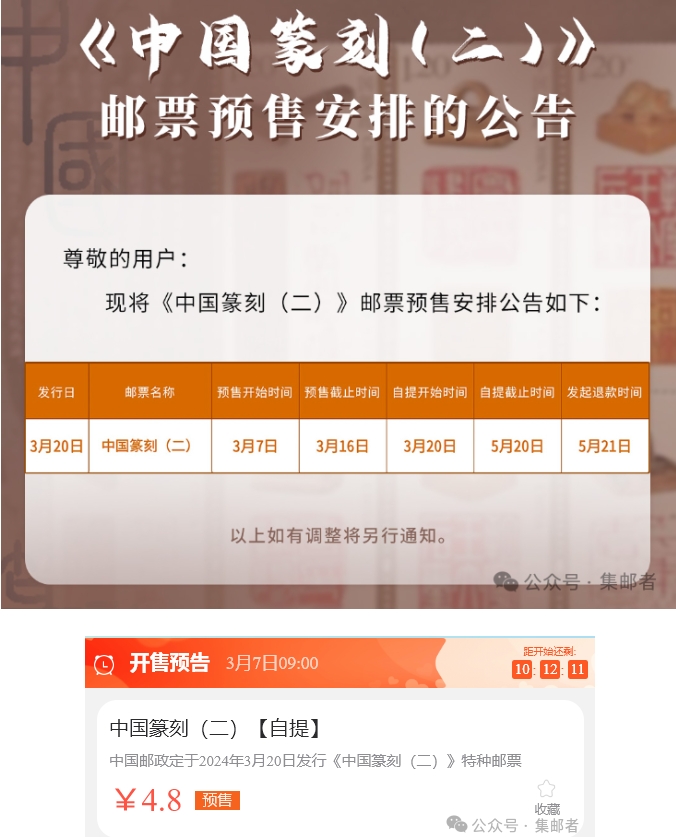 集邮者讯(JiCang.vip),中国邮政计划于2024年3月20日发行的志号2024-3T《中国篆刻(二)》邮票,刚刚公布了预售安排!