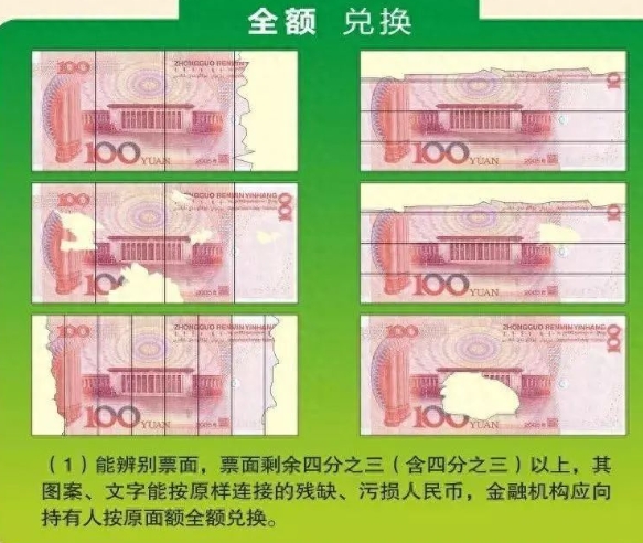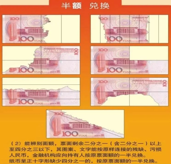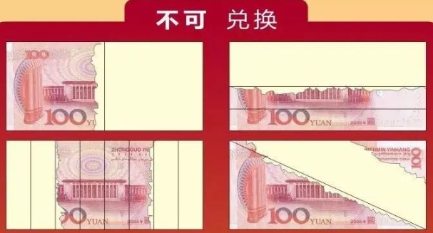 如果你收到了残缺的人民币,参考下面的标准,是可以拿到银行兑换的。