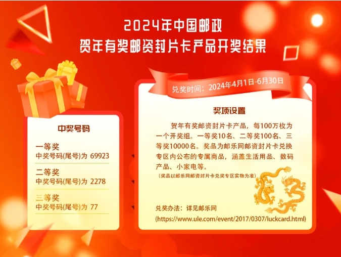 3月20日,2024年中国邮政贺年有奖邮资封片卡产品开奖结果产生。贺年有奖邮资封片卡产品每100万枚为一个开奖组,每个开奖组设3个奖项。奖品为邮乐网邮资封片卡兑换专区内公布的专属商品,涵盖生活用品、数码产品、小家电等,以邮乐网邮资封片卡兑奖专区实物为准。