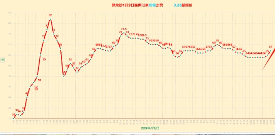一、下图是2024年贺岁纪念钞,简称龙钞、小龙钞或者绿龙钞,自2024年1月9日兑换面世,到3月26日晚间的价格走势变化情况。以普通标准十连号价格为参考,市场波动较大,价格体系也很多且复杂,没有完全统一的一个收盘价格标准,所以,图示的走势曲线价格点仅仅是取一个大概均值。