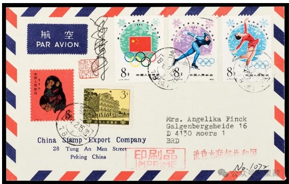 1980年T46“庚申猴”首日实寄封,封为中国邮票公司国际航空公事封,北京航空印刷品寄德国,贴T46猴一枚,J54(4-4)(4-2)(4-3)各一枚,普16邮票3分一枚,销北京(18支)2月15日首日日戳,有T46“庚申猴”邮票雕刻者姜伟杰签名盖章,少见,保存完好。