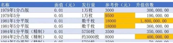 从上面这个表格可以看出来,单枚价格最高的硬币前三名分别是1981年1分平版(1.8万元),1981年5分平版(1.8万元)和1979年5分(9千5百元)。从升值的角度来看,1981年1分平版的升值倍数高居榜首,比面值升值了180万倍!紧随其后的是1981年1分凸版(精制),比面值升值了50万倍。接下来是1984年2分凸版,比面值升值了40万倍。
