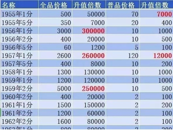 从上面这个表格看出,对于那些大量流通过的硬分币,从价格上来看,最贵的硬分币第一名是1959年2分(全品价格5000元,比面值升值25万倍),第二名是1956年1分(全品价格3000元,比面值升值30万倍),第三名是1957年1分(全品价格2600元,比面值升值26万倍)。这些硬币当年都是按照面值来流通的,如果有心人当年从银行兑换了全新的硬币而保留至今的话,那可不比任何一项投资的回报率低!