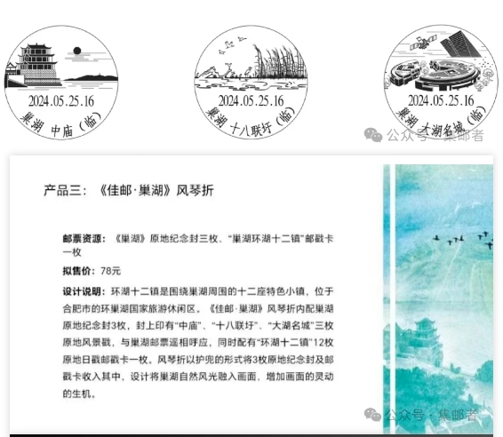 新邮《巢湖》表现内容→ 日期:2024-04-30 集邮者讯(JiCang.vip),5月25日即将发行的《巢湖》邮票,相关的邮戳及邮品公布,邮票的表现内容也出来了:一套3枚,分别表现:中庙、十八联圩、大湖名城