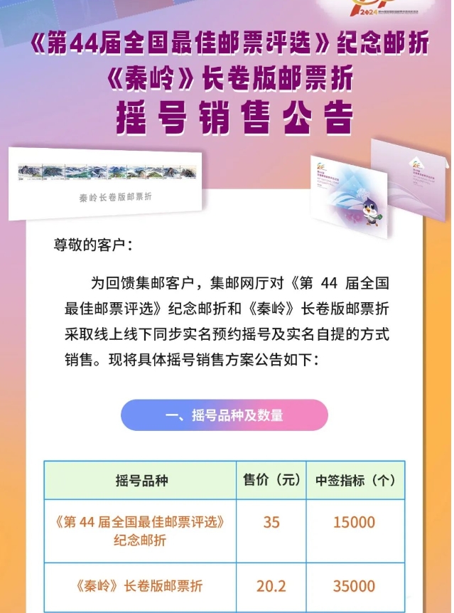 随着今年“最佳邮票评选”结果即将揭晓与《秦岭》邮票发行在即,中国邮政也将在5月22日开始针对《第44届全国最佳邮票评选》纪念邮折和《秦岭》长卷版邮票折的摇号: