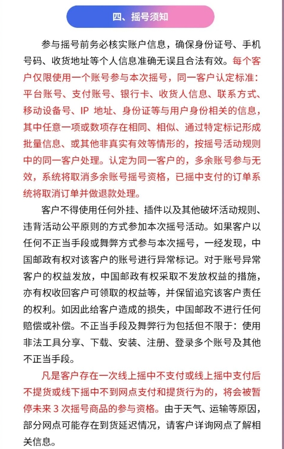 客户不得使用任何外挂、插件以及其他破坏活动规则、违背活动公平原则的方式参加本次摇号活动。如果客户以任何不正当手段或舞弊方式参与本次摇号,一经发现,中国邮政有权对该客户的账号进行异常标记。对于账号异常客户的权益发放,中国邮政有权采取不发放权益的措施,亦有权收回客户可领取的权益等,并保留追究该客户责任的权利。如因此给客户造成的损失,中国邮政不进行任何赔偿或补偿。不正当手段及舞弊行为包括但不限于:使用非法工具分享、下载、安装、注册、登录多个账号及其他不正当手段。