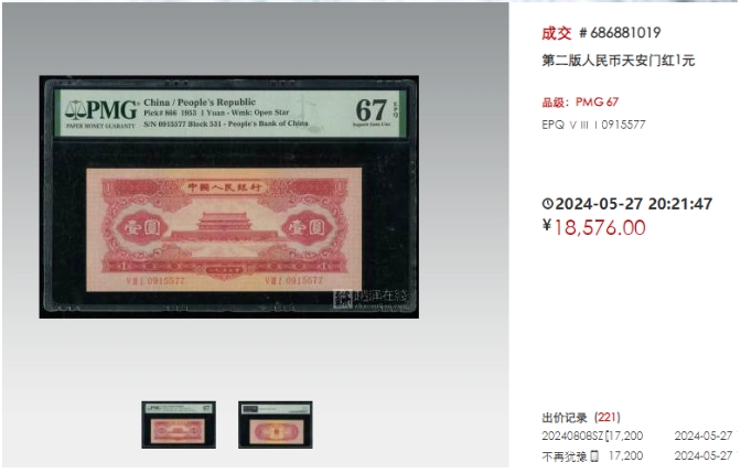 大家好,我是大嘴,继续和你们分享钱币知识。先照例上个图,按照图中描述,第二版人民币天安门红1元,最终成交价18576元,右下角有个出价记录,次数达到221次,应该说是相当激烈了!