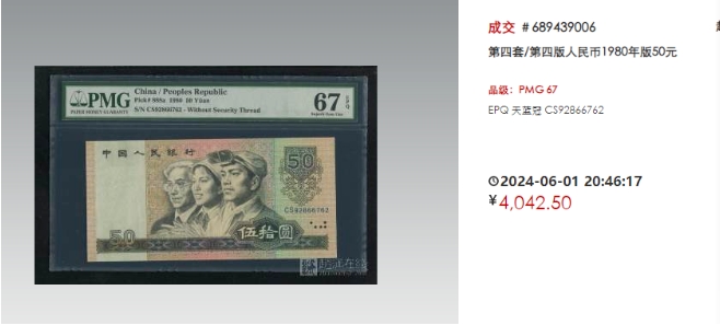 先上个图,前两天刚成交的一枚第四版人民币1980年版50元,最终价格4042元。前几天介绍的一些纸币,距离如今都比较遥远,像一版币、二版币很多年轻人基本没见过,但这枚纸币则不同,应该大多人都使用过,四版币印象很深刻。