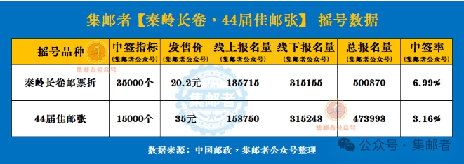集邮者讯(JiCang.vip),今天中国邮政公布了《秦岭长卷邮票折》《44届佳邮张》的最终摇号数据,这次也是"摇号新规"下,变化非常大的一次,让我们一起来看看数据吧。