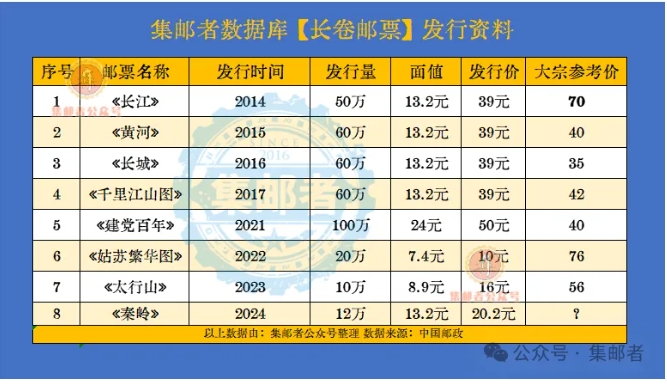 而秦岭长卷邮票,较2023年的太行山长卷,增量2万,发行量在12万,这个之前小集也分析过了,产品册都带长卷的话,可能导致发行量会增加的情况→《秦岭邮册增加长卷邮票》!