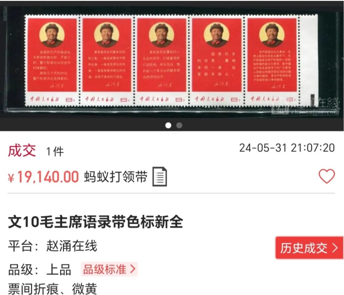 有阵子没有关注文革题材邮票价格了,近日赵涌平台上,一套上品文10毛主席语录带色标票,以19140元成交,具体见图。