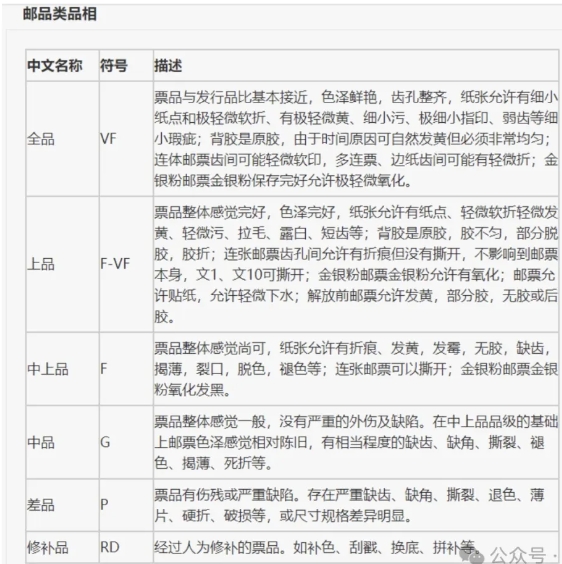 国内知名邮品交易平台赵涌在线对于品相的划分就有一套专业、成熟和完善的标准——从全品(VF)到上品(F-VF)、中上品(F)、中品(G)、差品(P),再到修补品(RD),品级层层分明,具体到每一套、每一枚邮票的品相描述上,更是细致入微,清晰了然!包含邮票纸张、色彩、图案、齿孔、背胶、金粉等等各个方面的详细描述,详情描述都有具体的标注——这是经过广大藏友认可的邮票品相标准,亦是行业内的标杆和风向标。