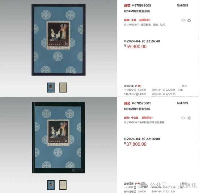 4月30日,上品(F-VF)的梅兰芳小型张新票在赵涌在线app的成交价为5.64万元,可谓经典不朽!而同一天其中上品(F)的成交价为3.78万元。邮票品相描述清晰,一目了然。