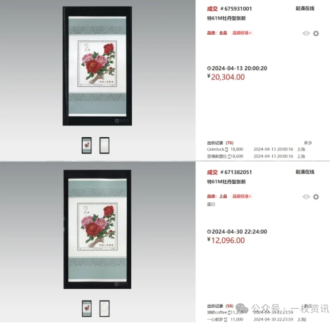 4月13日,全品(VF)品相的特61M牡丹小型张新票在赵涌在线的成交价为20,304元,而于4月30日成交的上品(F-VF)品相价格为12,096元。