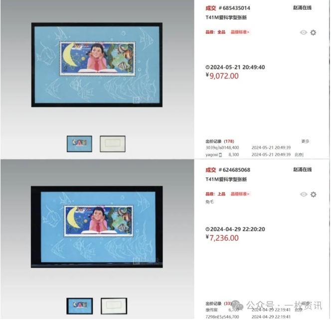 5月21日,全品(VF)品相的T41M爱科学小型张在赵涌在线的成交价格在9,072元;而4月29日,其上品(F-VF)的成交价为7,236元,价格相差了将近两千元。品相升一级,价格差距一目了然!