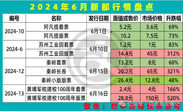 6月份共发行了《阿凡提》、《苏州工业园》、《秦岭》、《黄埔军校建校一百周年》四套新邮,在YZ内部下发严控新邮出货相关规定后,市场还是有所回应,新邮折扣依然存在,但折扣率下降,价格有所回升,单枚票市场一如既往表现比多枚票出色,9枚版大套票的《秦岭》小版邮票依然深度打折。