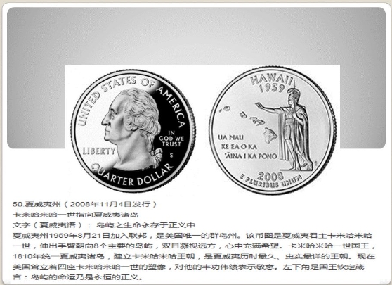 1997年,时任美国总统的克林顿签署了《50个州纪念币项目》的法令,意在让美国年轻人能从中了解到各州的历史、地理和传统文化知识。