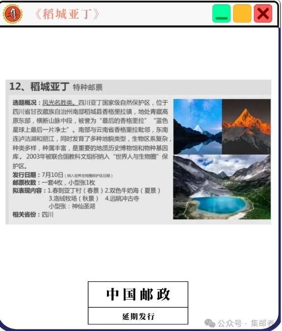 新邮《稻城亚丁》已确认推迟发行→ 日期:2024-07-07 集邮者讯(JiCang.vip),前段时间我们就聊过了,7月和8月的新邮图稿公布后,而原计划7月最早发行的《稻城亚丁》邮票,在7月10日发行,目前仍没有任何消息,基本可以确认推迟发行了。 因此小集说《封神演义(一)》是2024年首枚小型张品种,还误打误撞成真了。而《稻城亚丁》也将发行小型张品种,这样的话,发行量会不会比封神演义小型张还会少呢? 也有邮友猜测:延期发行可能使用了"影写版"工艺,或因为影写机器有问题了,因此也延期。这个暂时还不得而知,还是以官方公告为准吧!