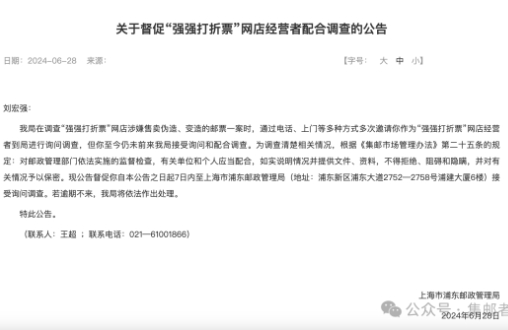 我局在调查“强强打折票”网店涉嫌售卖伪造、变造的邮票一案时,通过电话、上门等多种方式多次邀请你作为“强强打折票”网店经营者到局进行询问调查,但你至今仍未前来我局接受询问和配合调查。为调查清楚相关情况,根据《集邮市场管理办法》第二十五条的规定:对邮政管理部门依法实施的监督检查,有关单位和个人应当配合,如实说明情况并提供文件、资料,不得拒绝、阻碍和隐瞒,并对有关情况予以保密。现公告督促你自本公告之日起7日内至上海市浦东邮政管理局(地址:浦东新区浦东大道2752—2758号浦建大厦6楼)接受询问调查。若逾期不来,我局将依法作出处理。