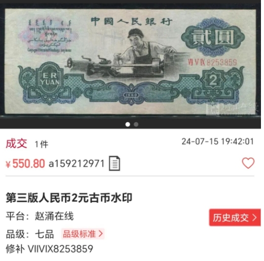 近日,一枚车工2元古币水印七品的拍出了550元,具体见图。