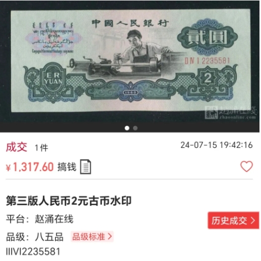 这枚八五品古币水印车工拍出了1317元,比起原来的七品550元,等于是翻了一番了!