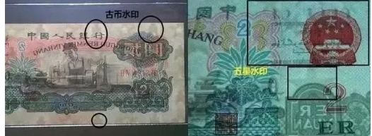 最后说说古币水印的特点,2元车工其实分为两个版别,分别为古币水印和五星水印。