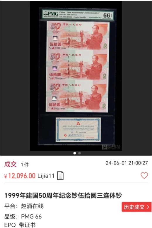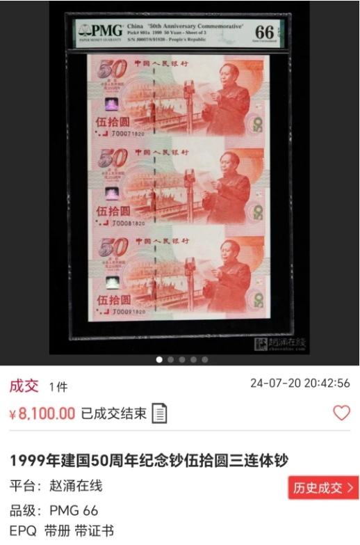 从上面拍品描述来看,这是一枚1999年建国50周年钞五十元三连体钞,PMG评级分数还挺高66分,特别还做了注明,带册、带证书,这么一枚稀缺的三连体建国钞拍出了8100元,大家一定会觉得很高价了吧。