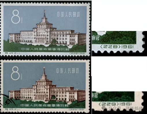特45《中国人民革命军事博物馆》邮票的第1图“中国人民革命军事博物馆前景”,其志号中的顺序号为“228”,但有的误为“229”(图2)。
