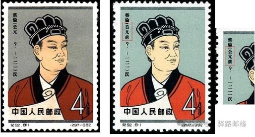 纪92《中国古代科学家(第二组)》邮票的第1图“蔡伦像”,其原设计图案中蔡伦的生年误为“公元前?”,1962年6月北京邮票厂已将该图的印筒制好,因赶印纪94《梅兰芳舞台艺术》邮票,故推迟印制纪92。当年9月开始印制纪92时,邮票发行局通知北京邮票厂将“公元前?”改为“公元?”(图3)。