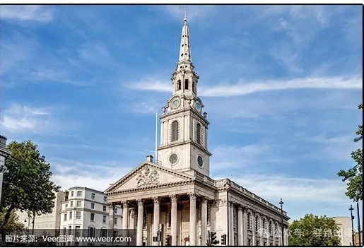 纪107邮票图案以马克思和恩格斯的头像为主图,衬以国际共产主义运动旗帜。底部应该第一国际成立时的会场旧址是英国伦敦恩德尔街圣马丁堂(图5),由于提供资料的单位把资料搞错了,这枚邮票图案误画成英国伦敦圣马丁教堂(图6)。