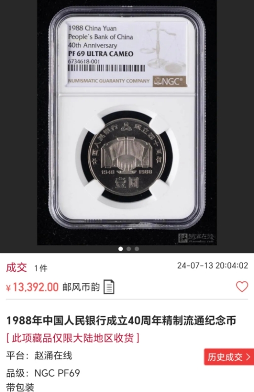 当然了,那些高分评级币就价值更高了,下面这枚就是评分高达69分的建行纪念币,最终成交价在13392元!
