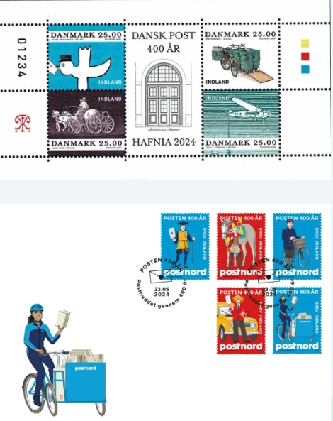 欧洲集邮联合会 (FEPA)邮展将于2024年10月17日至20日在丹麦哥本哈根举办。1624年12月24日,丹麦国王克里斯蒂安四世颁布邮政新法令,以此为丹麦邮政的建立日期。此次邮展即是为了纪念丹麦邮政建立四百周年,由丹麦集邮俱乐部(KPK)主办,展出规模为1500框邮集,在大金奖类邮集中将展出15部欧洲顶级水平的邮集。附图为丹麦邮政在2024年1月1日和5月23日为此次邮展发行的小型张和《邮递员》邮票。