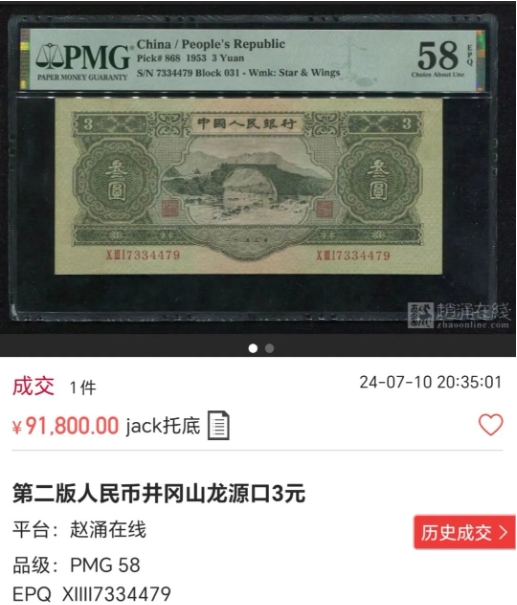 从上面拍品描述上看,这枚苏三元pmg评分为58分,其实这个分数并不算高,但最终成交价在91800元,接近10万了,这真是亮瞎了我们的双眼啊!