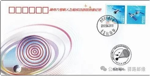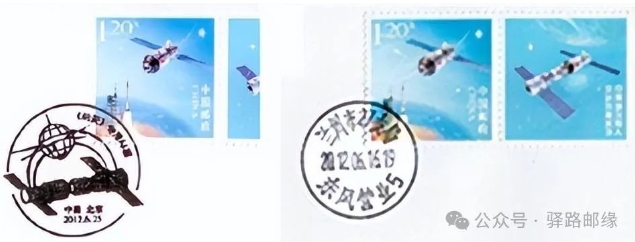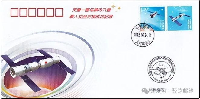 正面有“天宫一号与神舟九号载人交会对接成功纪念”字样,贴票同样为2012年6月25日才公开发行之《航天》个性化邮票原票,而邮戳日期是2012年6月24日。
