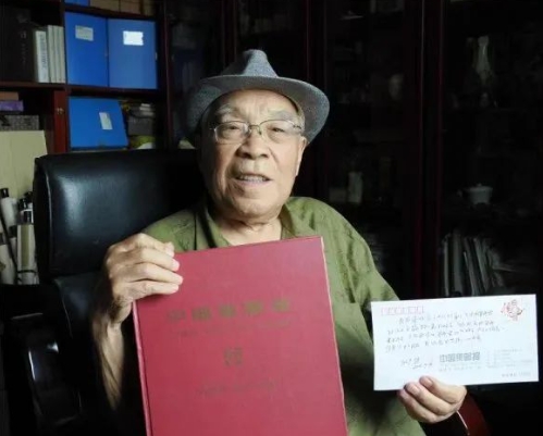 应记者的请求,孙老将担任《中国集邮报》业余编辑的感想写在记者提供的一枚《中国集邮报》公函封上,署名,盖章,并手持信封,与1993年《中国集邮报》合订本合影。